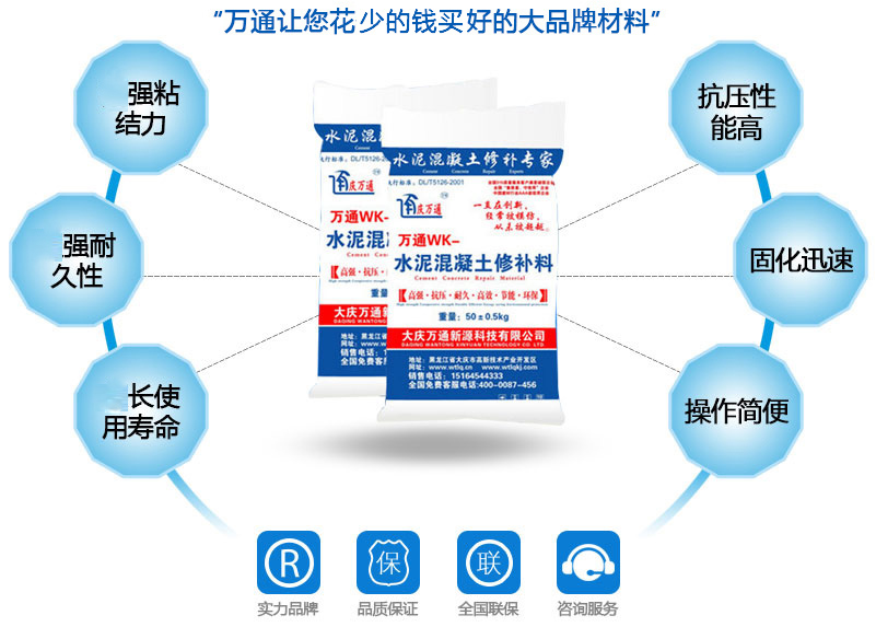 大慶萬通新源科技有限公司獨有的混凝土路面高強速補料,是水泥混凝土路面病害修復(fù)的好材料。疲勞、凍融循環(huán)、彎曲壓力、滲水和基層破壞等原因都會引起水泥路面的破損,從而帶來高昂的維護(hù)費用。與以往的剛性修補方法不同,混凝土水泥路面維修速補膠提供了一種獨特的柔性修補產(chǎn)品和技術(shù),高柔性、高抗拉性,可跨伸縮縫施工和高抗壓性使得混凝土快補產(chǎn)品為水泥混凝土路面提供了******性的修補。傳統(tǒng)的剛性修補方案,如環(huán)氧砂漿和快干水泥產(chǎn)品,由于其自身的粘結(jié)失效,抗疲勞性低以及與原路面不同的伸縮系數(shù),修補面會在短時間內(nèi)失效或產(chǎn)生新的裂縫,需要反復(fù)修補,有效期短且費用高昂。大慶萬通新源科技有限公司的混凝土水泥路面維修速補膠可以隨原路面一起伸縮,移動,從而避免了粘結(jié)失效和產(chǎn)生新裂縫。萬通快補產(chǎn)品優(yōu)異的粘結(jié)性、柔韌性和高防滑性,特別適用于水泥路面的淺層粘合修補,多邊角混凝土板層修補,跨伸縮縫修補以及路面沉陷修補。萬通混凝土病害修補料針對混凝土起皮起沙、斷板裂縫、蜂窩麻面、坑槽露石子、漏筋掉皮、橋梁的掉皮漏筋快速通車使用時間長。應(yīng)用萬通快補產(chǎn)品,施工后一天就可以恢復(fù)交通。大慶萬通新源科技有限公司的萬通水泥路面維修速補膠適用于高速公路、機場路面、農(nóng)村村村通路面、廠坪、學(xué)校操場、市區(qū)公路、小區(qū)路面、橋梁、水泥路面的修補。使用萬通特快補材料修補路面可以一勞永逸! 水泥地面起砂怎么辦,混凝土修補劑混凝土地面起砂,混凝土地面修補,地面起砂怎么辦,